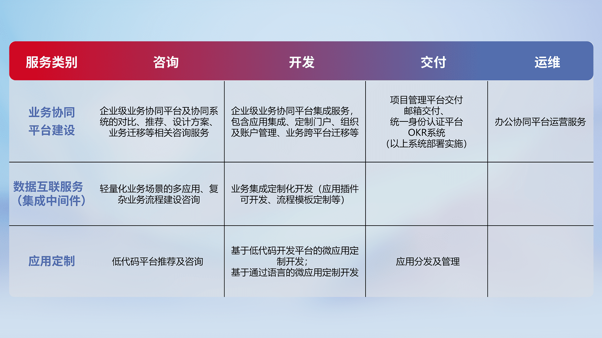 针对钉钉、、、、企微、、IDaas等平台级产品提供产品的规划、、方案、、交付、、、、定制化开发等服务,,,,实现如统一协同办公、、智能客户服务、、、、混合会议管理、、智能数据查询、、等业务场景,,,实现数字化转型。。。